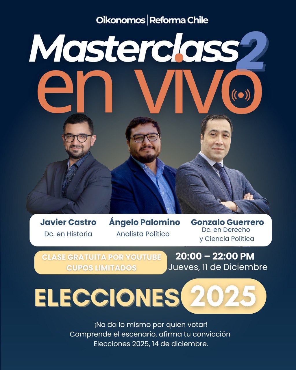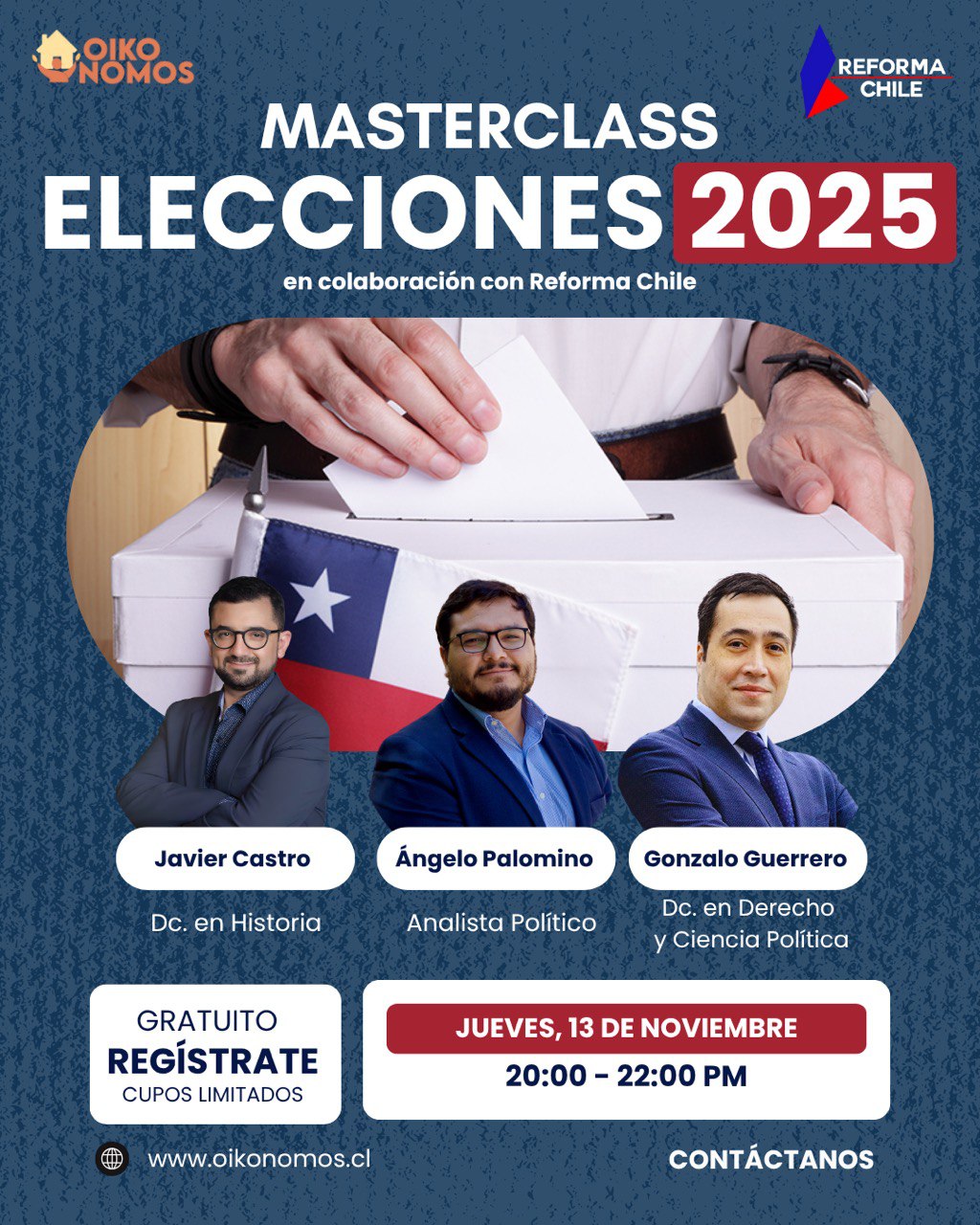 Durante noviembre y diciembre de forma conjunta, Oikonomos y Reforma Chile, realizaron dos charlas informativas sobre las elecciones presidenciales y parlamentarias (2025) en Chile. En estas instancias participaron: Javier Castro, doctor en historia; Gonzalo Guerrero, doctor en derecho y ciencia política; y Angelo Palomino, Máster en Estudios Políticos.